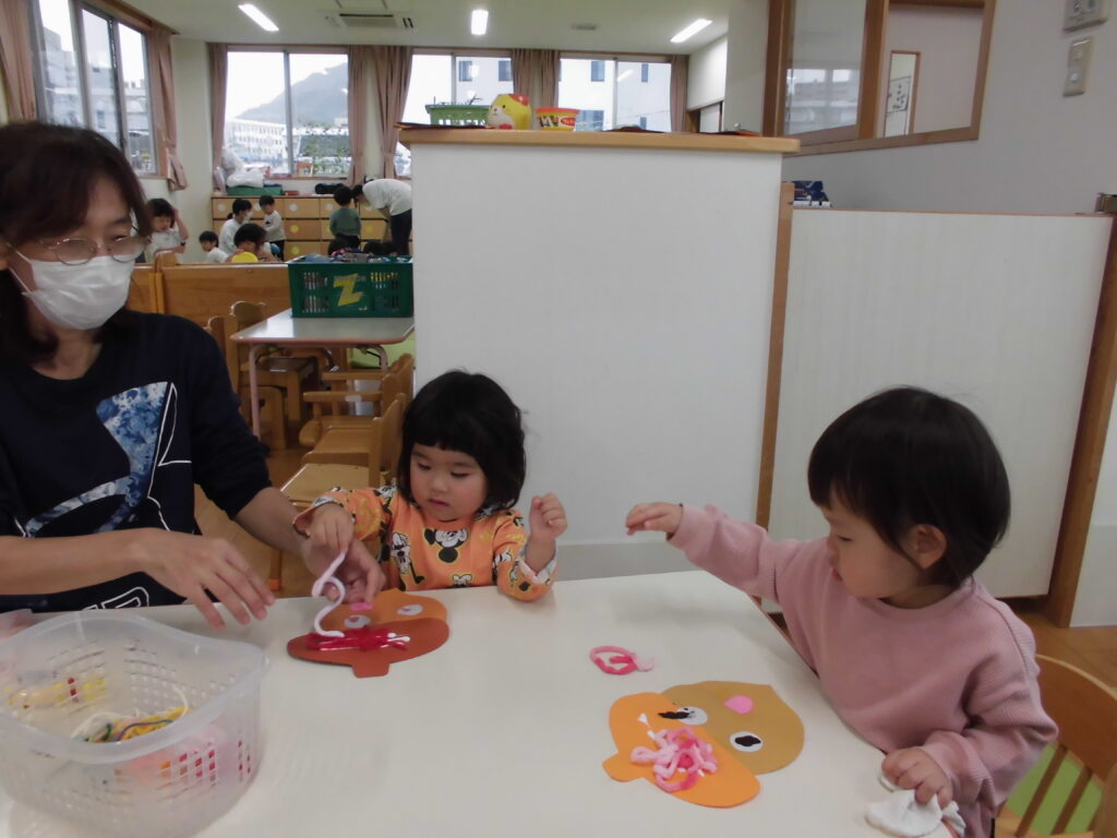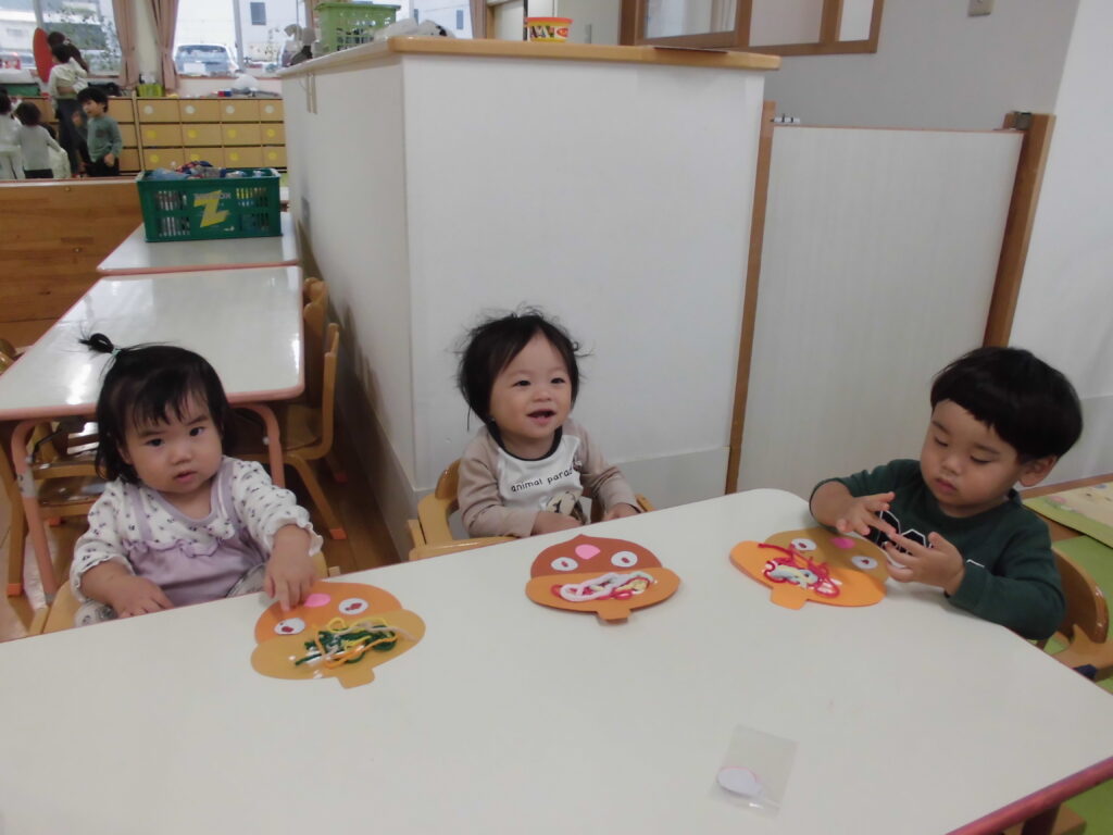 毛糸を貼ったり、指スタンプをしたりして、どんぐりを作ったよ😊💕