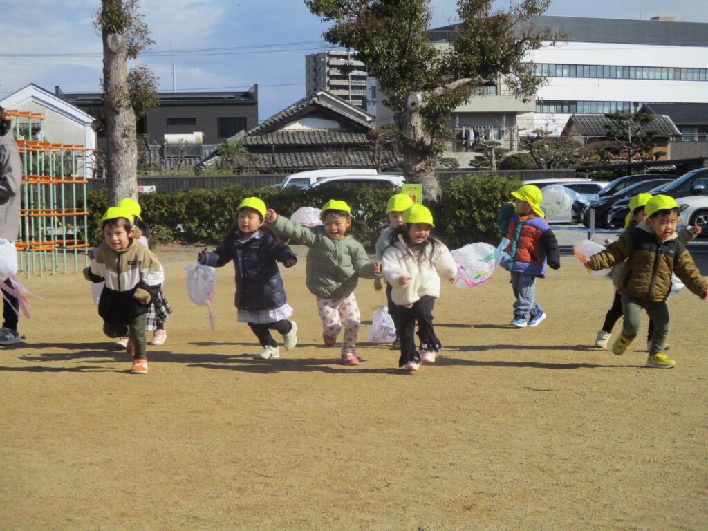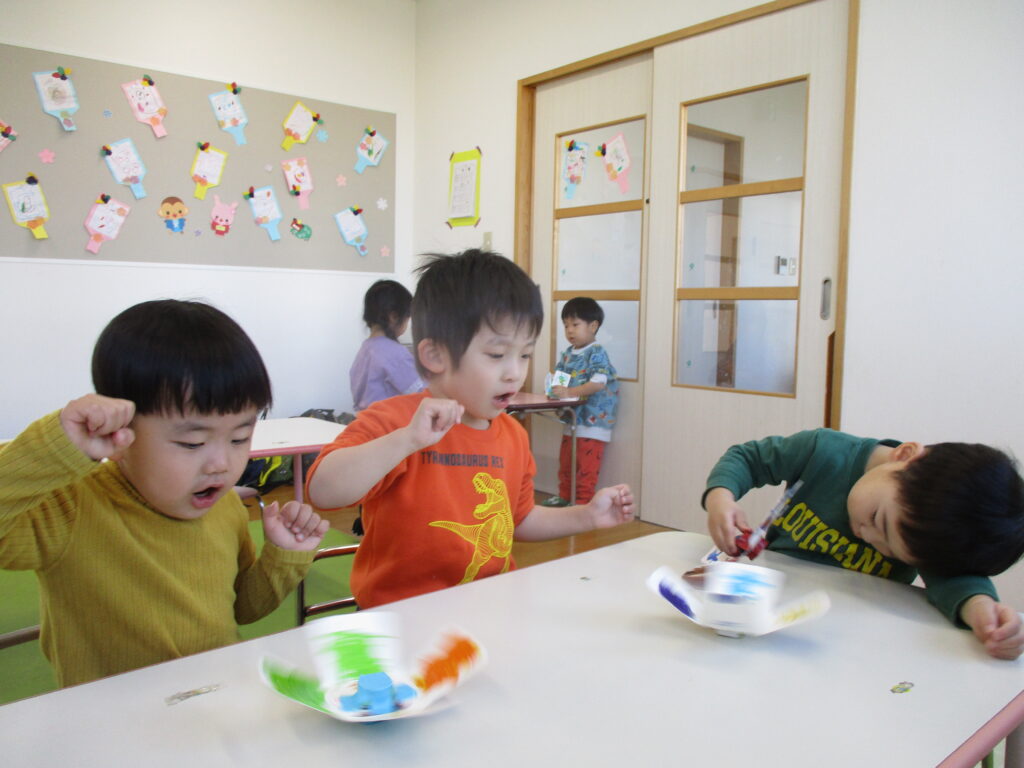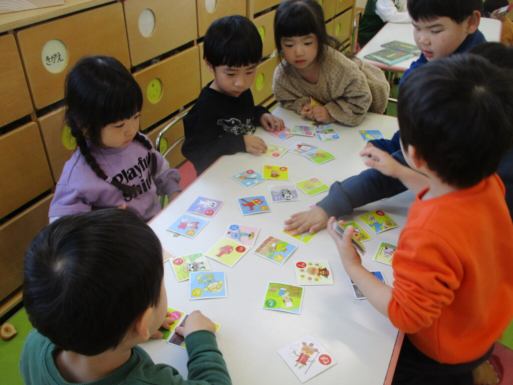 お正月遊びを楽しみました。牛乳パックで作ったコマで遊んだり、カルタ遊びをしたよ(*^-^*)
