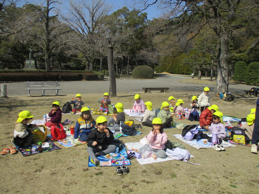 「えんそく、いつ?」「たのしみ🎵」と言って、楽しみにしていた子どもたち。リュックをせおって、いざ、出発。しだれ桜の広場まで行ってきました。
