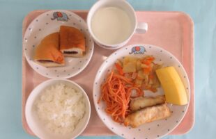 2026.03.27鮭のチーズ焼き コンソメスープ もやしと油揚げの酢の物 りんご(午後のおやつ:豆腐きな粉団子 牛乳)