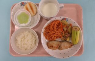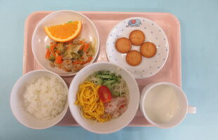 冷やしそうめん ホイコーロー オレンジ(午後のおやつ:飲むヨーグルト ビスケット)