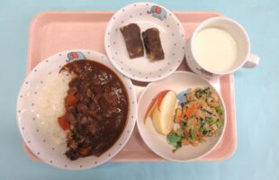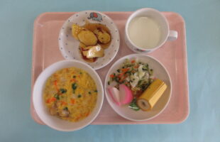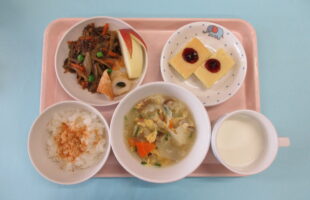キャベツとベーコンのスープ ごぼうのきんぴら ちくわの煮付け きな粉かけ りんご(午後のおやつ:米粉ケーキ、ジャムソース添え 牛乳)