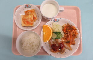 厚揚げのポークケチャップ煮 きゅうりの甘酢和え かぼちゃの煮物 オレンジ(午後のおやつ:チョコチップホットケーキ 牛乳)