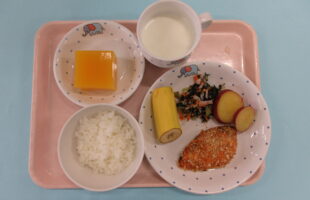 魚のサクサクゴマ焼き ひじきと野菜のキャロット和え さつまいもの甘煮 バナナ(午後のおやつ:オレンジゼリー 牛乳)