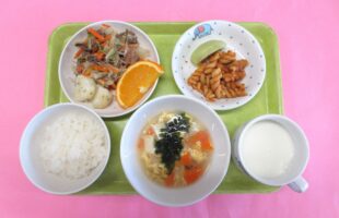 牛肉と野菜の塩こうじ炒め 粉ふき芋 中華スープ オレンジ(午後のおやつ:マカロニあべ川 キウイ 牛乳)