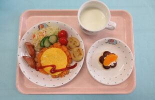 ★お誕生会 お月見ランチ オムライス ウインナーソテー 3色サラダ アンパンマンポテト ミニトマト(午後のおやつ:プリンアラモード 牛乳)