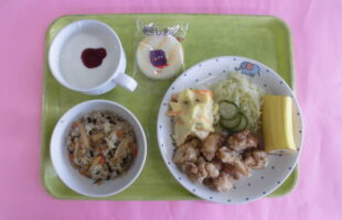 2026.04.07たけのこご飯 鶏肉のから揚げ ポテトサラダ ボイル野菜 バナナ (午後のおやつ:ヨーグルト(ジャム) せんべい)