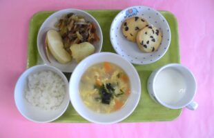 2026.04.08スタミナ焼き 粉ふき芋 中華スープ りんご(午後のおやつ:チョコチップクッキー 牛乳)