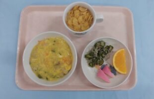 2026.03.25カレーライス 切り干し大根のツナ和え オレンジ (午後のおやつ:ヨーグルト(ジャム) おせんべい)