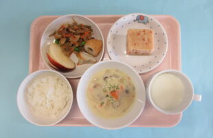 2025.10.10鮭のムニエル 里芋の味噌汁 切り干し大根のゴマ酢和え りんご(午後のおやつ:バナナヨーグルト)
