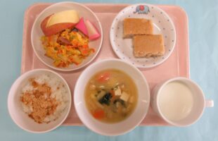 2026.01.19白菜の味噌汁 キャベツの卵とじ かまぼこの煮付け きな粉かけ りんご (午後のおやつ:苺ジャムの米粉ケーキ 牛乳)